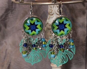 Boucles d’oreilles pendantes avec cabochon à motif étoile à sept branches, symbole de chance dans beaucoup de civilisations, feuille de philodendron pour le côté forêt tropicale, perles et breloques.
