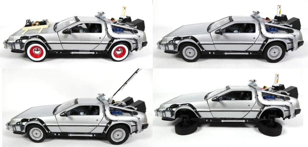 Lot de 4 véhicules miniatures à l’échelle 1:24 de la célèbre Delorean, la voiture du Dr Emmett Brown qu’il a transformé en machine à voyager dans le temps grâce au Plutonium.